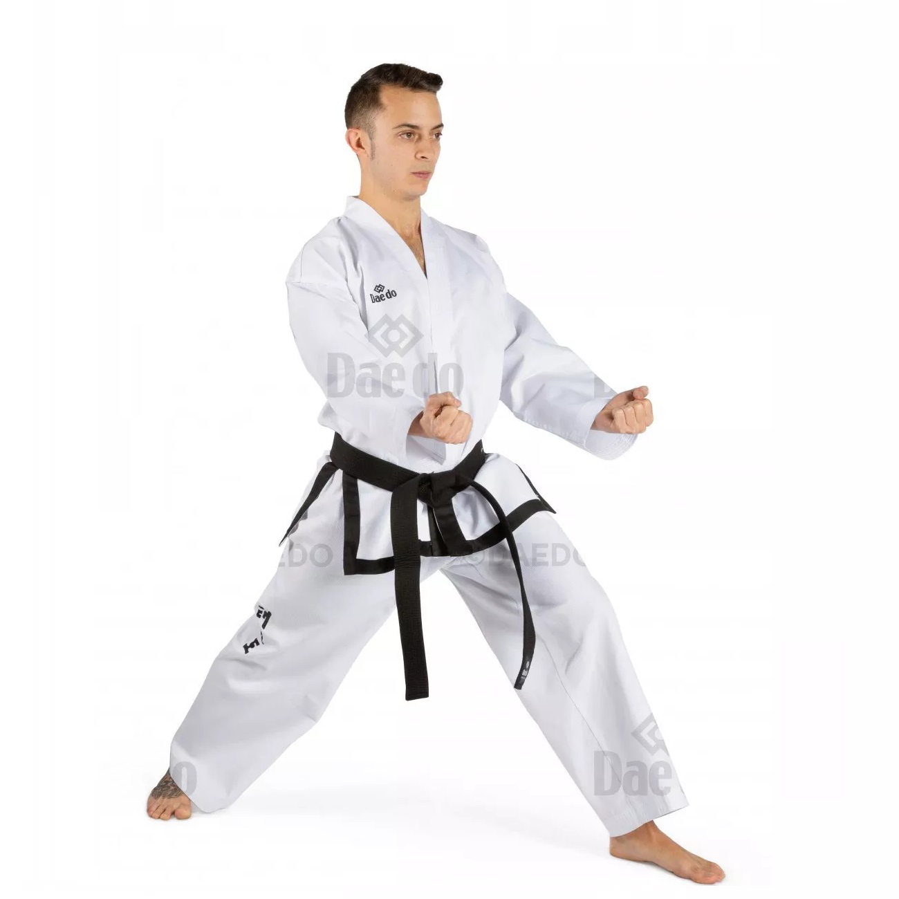 Chaqueta abierta según el modelo ITF Dan para Instructores y Maestros, bordado en la espalda y laterales del pantalón. Pantalón extra ancho con cintura elástica, tejido rayado, chaqueta bordada en la espalda que dice «Taekwondo», traje ligero.