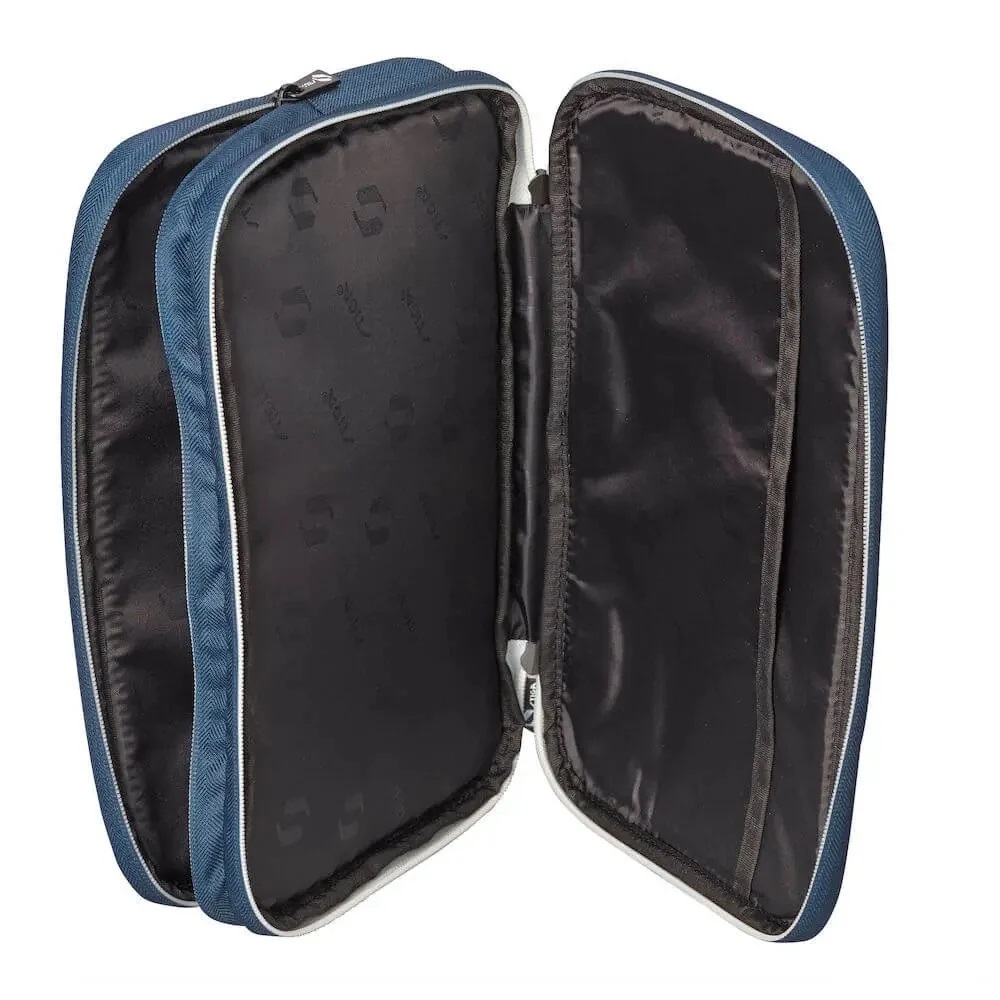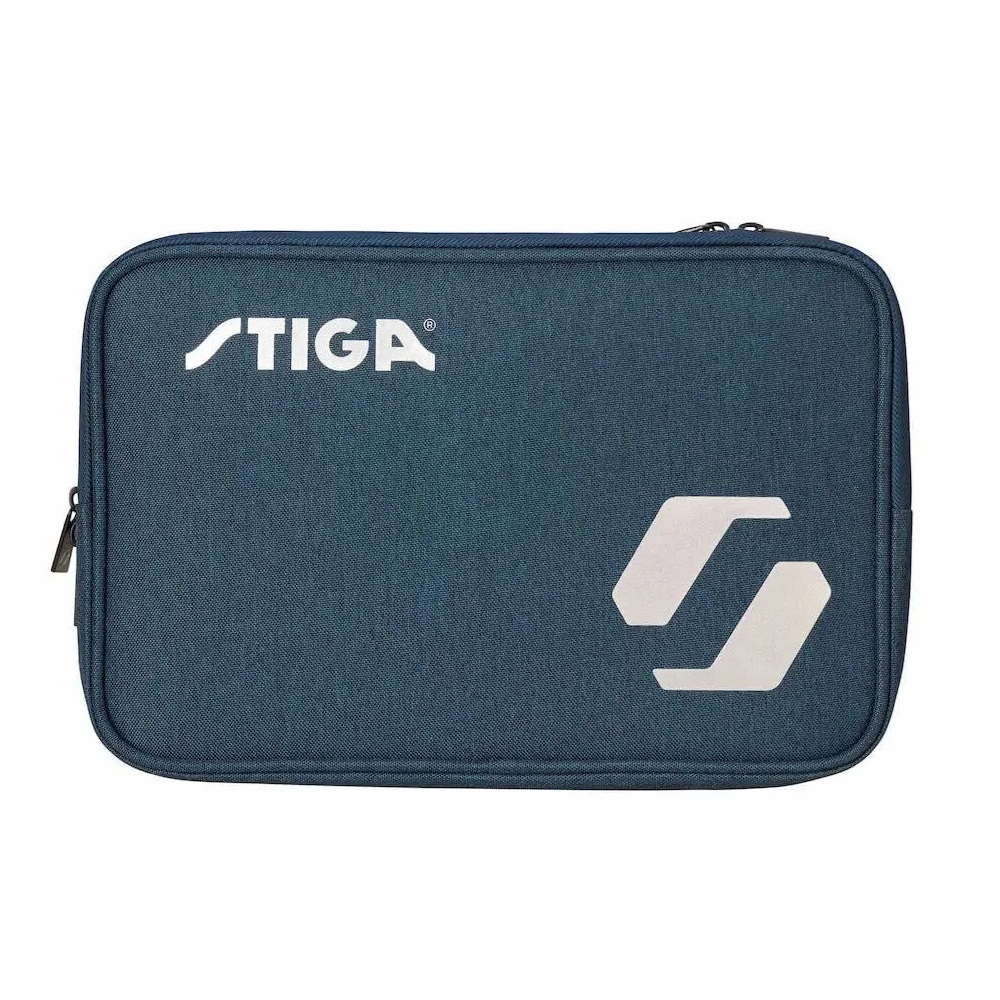 Práctica funda dobles para paletas. Fabricada en nailon/poliéster Oxford resistente al agua y duradero que protege las paletas cuando no se utilizan y garantiza una mayor vida útil. Con la funda para paletas Rival de STIGA, sin duda dejarás una buena impresión en la pista de tenis de mesa. Rival presenta el logotipo de STIGA Sports impreso en plata.